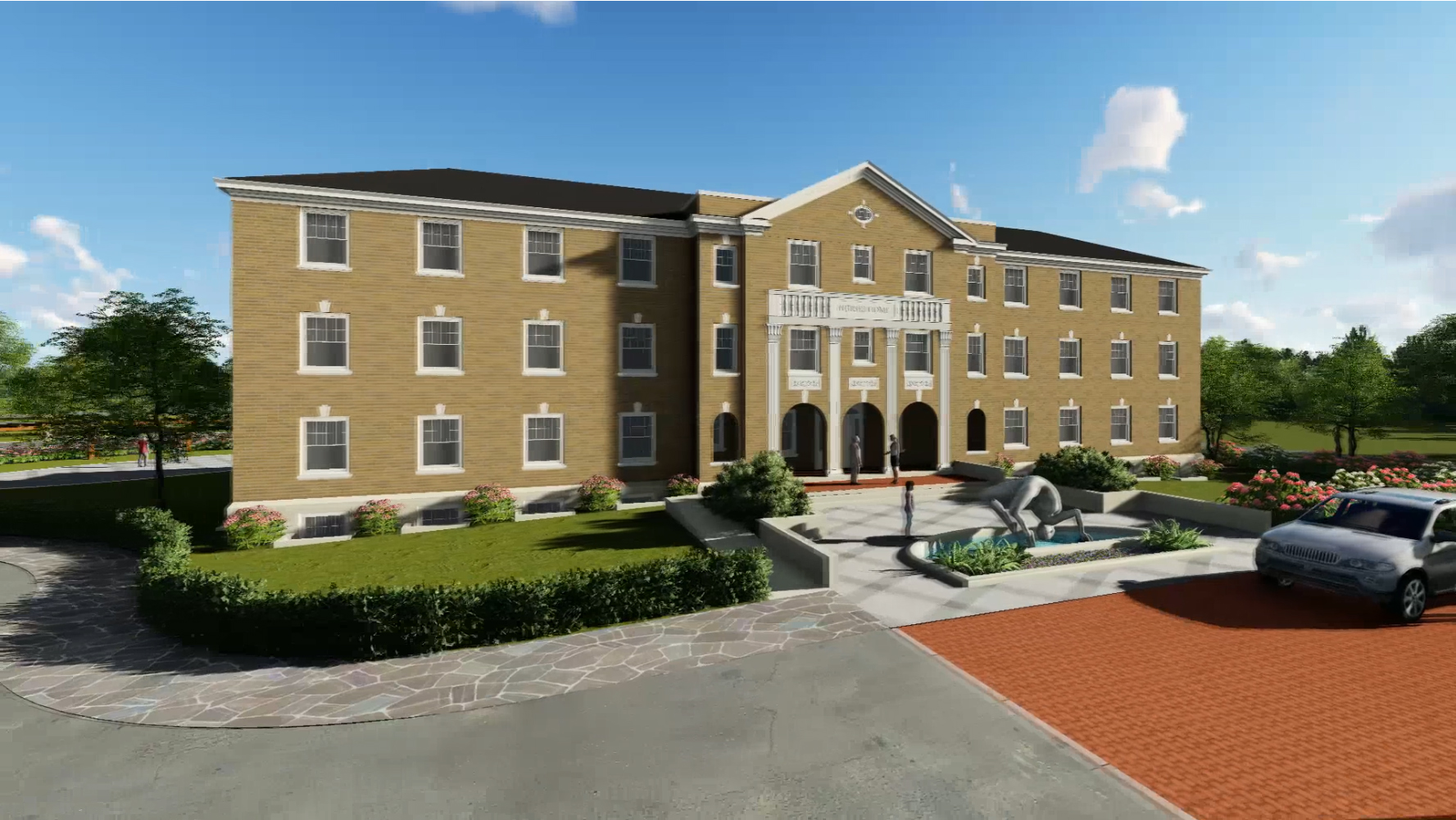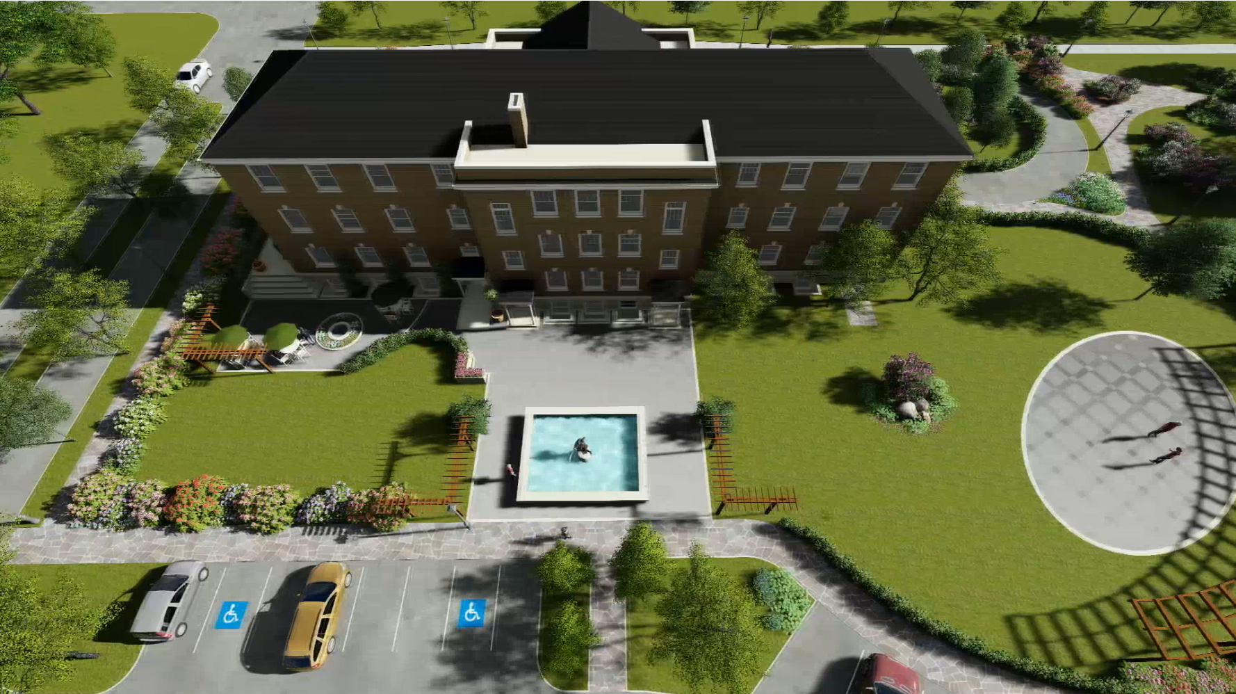 - Front Entry Plaza — This elevated terrace serves as an elegant arrival zone with a water feature, a garden, and the Centre’s signature sculpture in a natural setting. It also hosts public performance events on the front lawn.